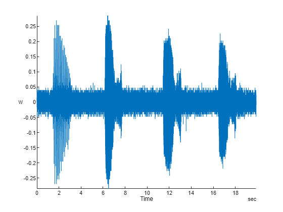 태평양 흰긴수염고래의 오디오 데이터를 4kHz로 샘플링한 파일을 불러옵니다. 이 파일은 코넬대 생물 음향학 연구 프로그램(Cornell University Bioacoustics Research Program)에서 관리하는 동물 소리 라이브러리에서 생성된 것입니다. 피치를 올려서 울음소리가 더 잘 들리도록 데이터의 시간 스케일을 1/10로 압축했습니다. 신호를 MATLAB® 타임테이블로 변환하고 플로팅합니다. 이 신호의 잡음은 네 가지 특징이 두드러집니다. 첫 번째 소리는 짧게 반복되는 소리이고 나머지 세 번의 소리는 긴 울음소리입니다.
