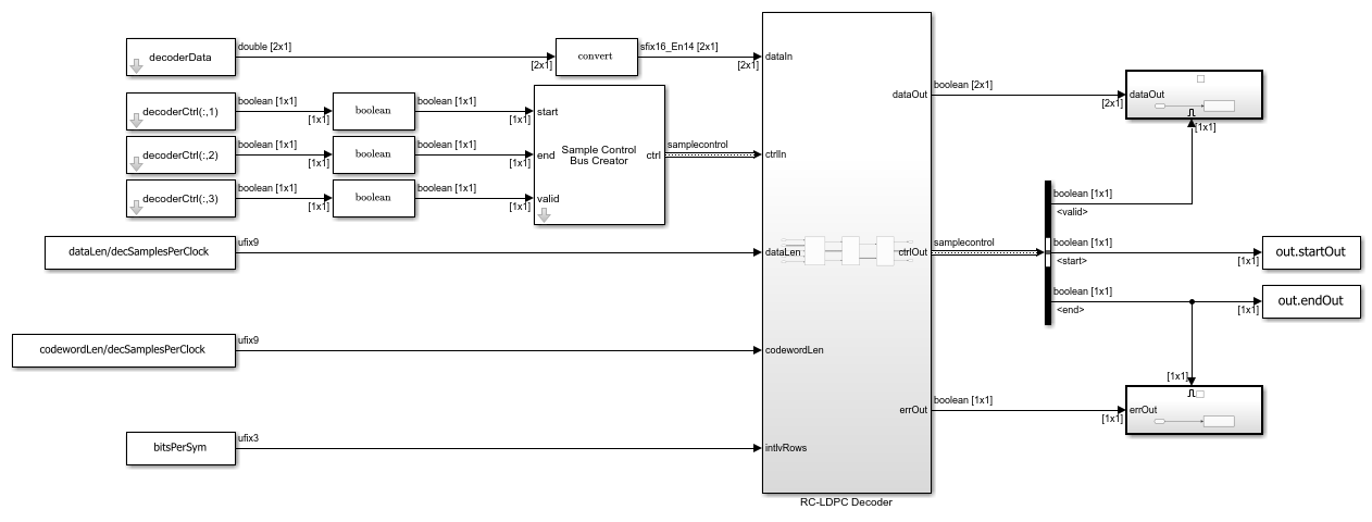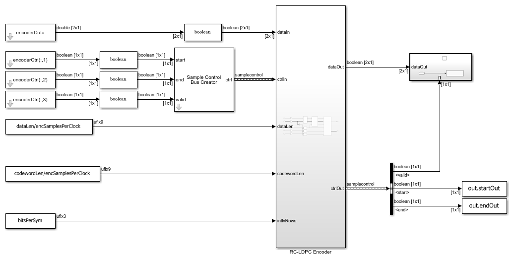 The Simulink model implements the RC-LDPC encoder algorithm for HDL code generation. The model uses a fixed-point streaming design with control signals. The design supports multiple samples per clock for the data ports to achieve higher throughput.