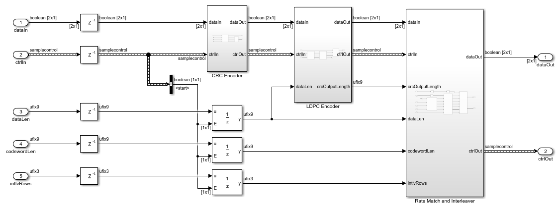 • The CRC Encoder subsystem includes the General CRC Generator HDL Optimized block. This block generates and concatenates the CRC bits to the input data bits. This subsystem implements step 1 of the encoder MATLAB reference.
