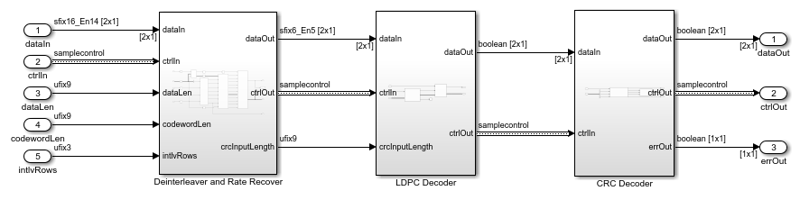 • The LDPC Decoder subsystem decodes the LDPC codeword by using the LDPC Decoder block, and then removes the filler bits. This subsystem implements steps 5 and 6 of the decoder MATLAB reference.