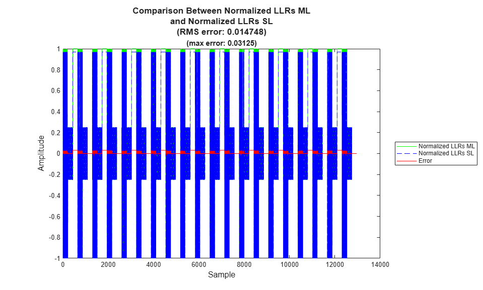 • The runRCLPDCML script defines the coding scheme, tunable codeword parameters, and design constants required by the encoder and decoder. The script runs the encoder MATLAB reference to encode data bits into codewords, distorts the encoded data with a channel model, and then decodes the distorted signal with the decoder MATLAB reference. The channel performs three steps. First, modulate the input codeword bits onto quadrature-amplitude-modulation (QAM) symbols. Second, distort the symbols with additive-white-gaussian noise (AWGN). Last, demodulate the distorted symbols to generate approximate-LLR soft-decisions. The script displays the RC-LDPC code parameters from the coding scheme definition and tunable input parameters. The script verifies the received bits against the transmitted bits, to compute the bit error rate (BER), and uses the CRC error output to compute the block error rate (BLER). The script displays a constellation diagram of the AWGN distorted QAM symbols. Running the runRCLPDCML script allows for design exploration in MATLAB.