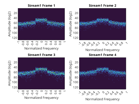 To simulate the model, a band-limited noise signal is generated using a random number generator and a low-pass filter. This signal is the input signal to both stream ports simultaneously. You can visualize the output by using the hPlotSimulationResult helper function. Four frames of data are plotted for visual verification of each port.