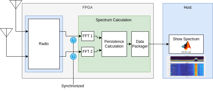 In this design, two RF data streams captured on independent radio antennas are input to the spectrum visualization system through the on-board analog to digital converter (ADC) and digital down converter (DDC). Within the spectrum monitoring algorithm on the FPGA, a spectrum calculation is performed that applies an FFT to each incoming data stream. Then, a density calculation is performed on each FFT output to determine the spectral density over a specified time period. Finally, the data is packaged in a single output stream so that it can be sent to the host for visualization.
