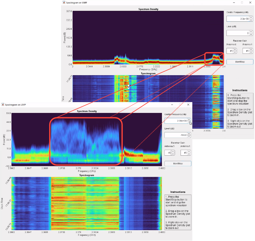 This example shows how to deploy a real-time, wideband spectrum visualization design on an NI™ USRP™ radio. The algorithm synchronizes data streams from two antennas to produce a spectrogram with twice the bandwidth that a single antenna can achieve.