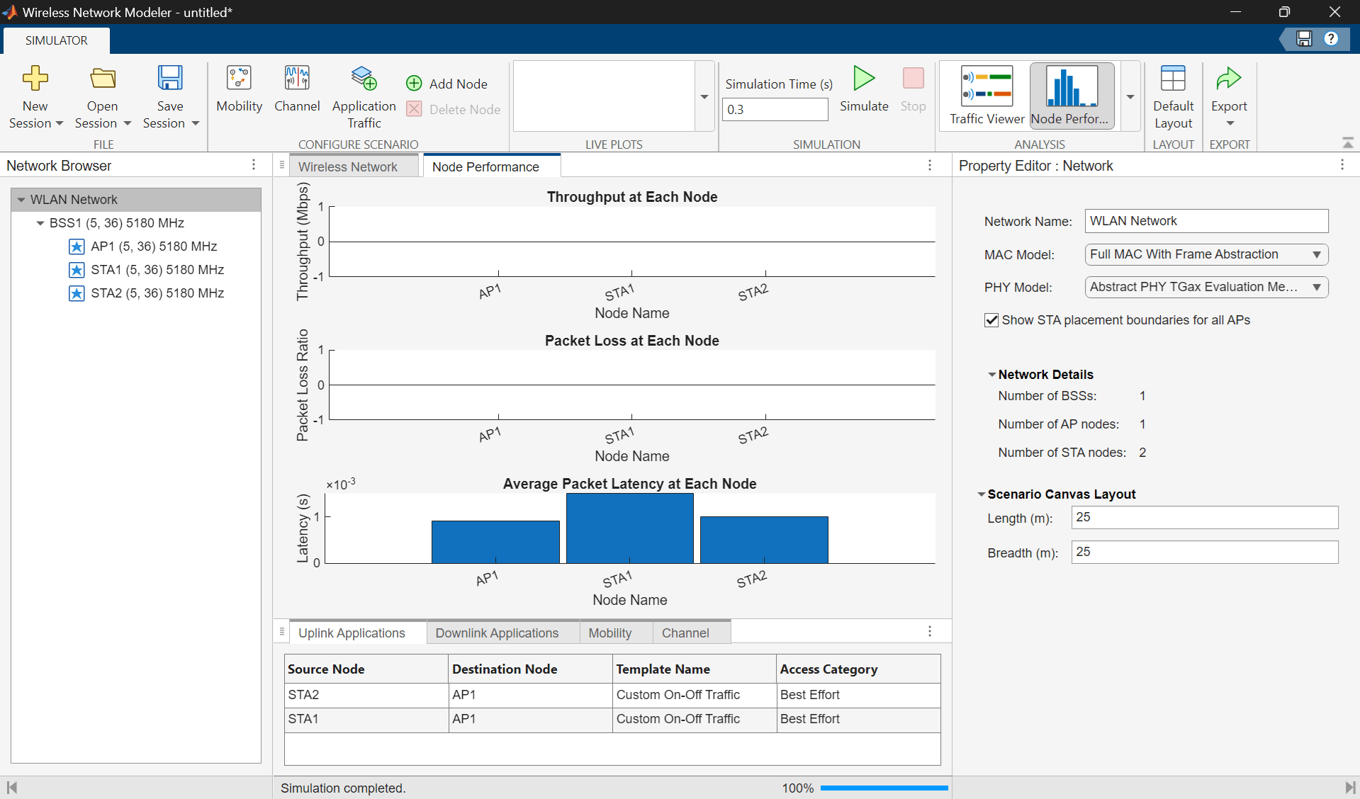 On the app toolstrip, click Simulate in the Simulation section. To analyze the throughput, latency, and packet loss of the nodes, click Node Performance in the Analysis section. You can monitor progress using the status bar at the bottom of the window. This displays the Node Performance pane.