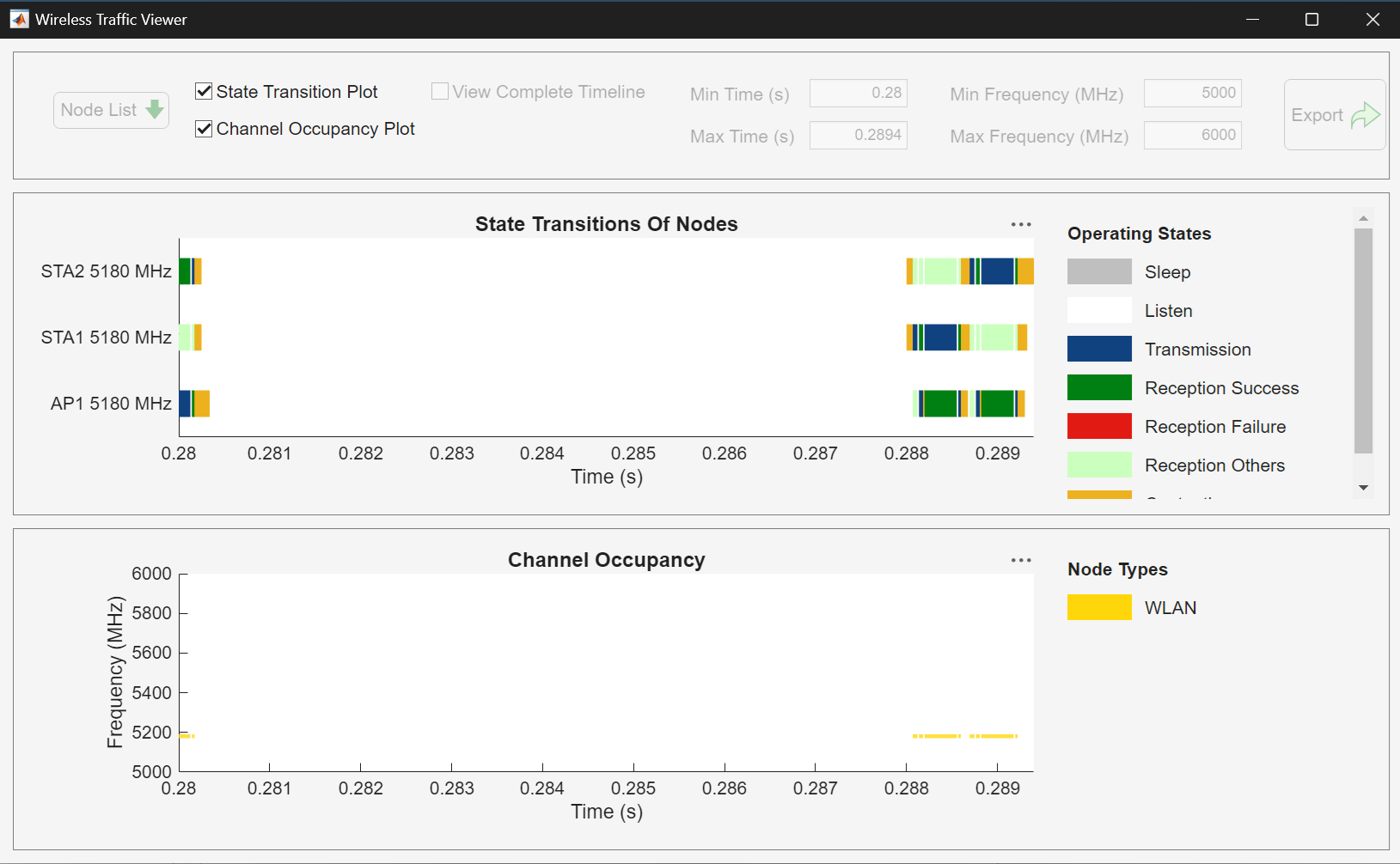 To view the state transitions and channel occupancy of the WLAN nodes, click Traffic Viewer in the Analysis section. The Wireless Traffic Viewer window provides a visual summary of how each node transitions between the contend, transmit, receive, listen, and sleep states.