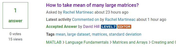 User Levels have become a best practice for many community sites to adopt. They help build trust in the community and provide recognition to contributors. There are 10 levels in the system and the labels will display next to users’ names throughout MATLAB Answers and on your community profile. We hope to see more users climb the ladder and level up!