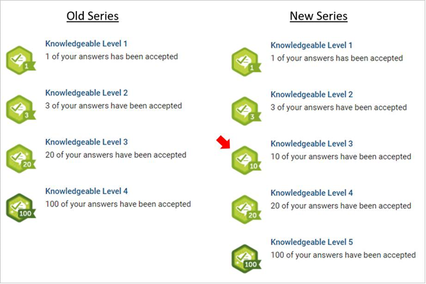 - The Knowledgeable badge series and the Thankful badge series now have 5 levels.